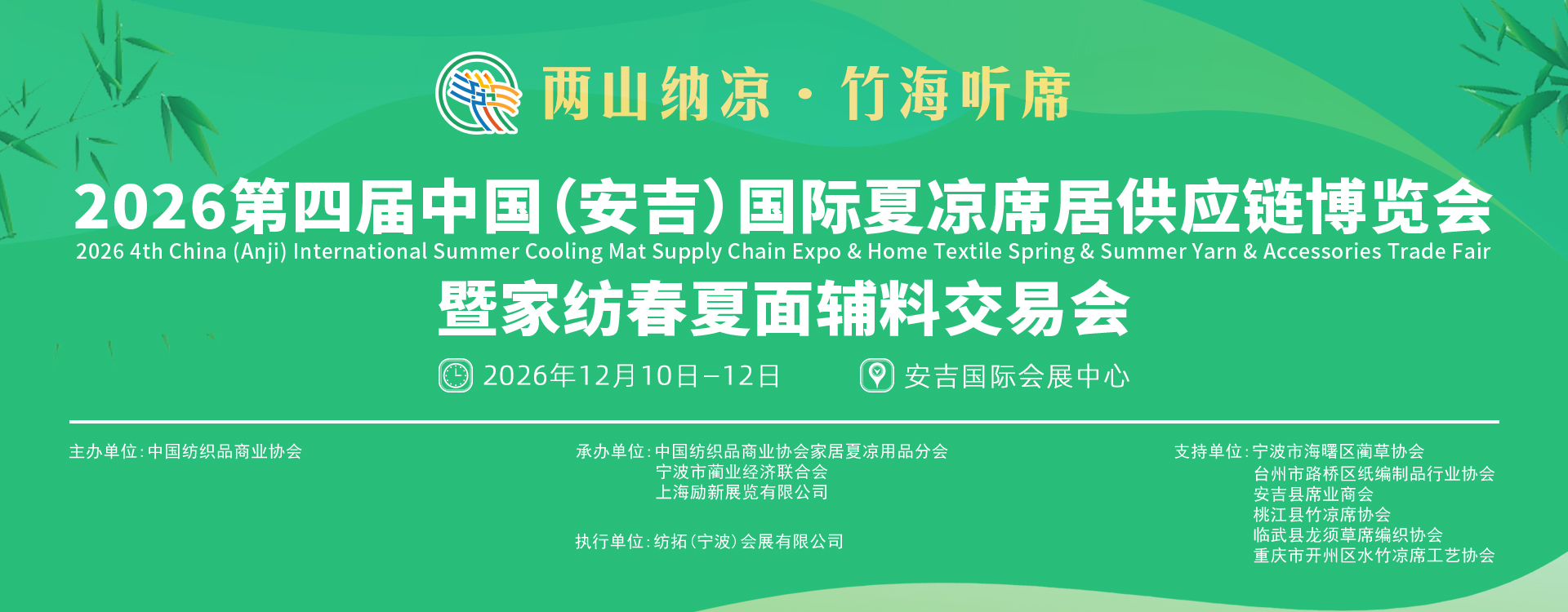 由中国纺织品商业协会主办,中国纺织品商业协会家居夏凉用品分会、宁波市蔺业经济联合会、上海励新展览有限公司联合承办的2026第四届中国(安吉)国际夏凉席居供应链博览会暨家纺春夏面辅料交易会(简称"夏博会")将于2026年12月10日一12日在"中国竹凉席之都"浙江安吉举办。